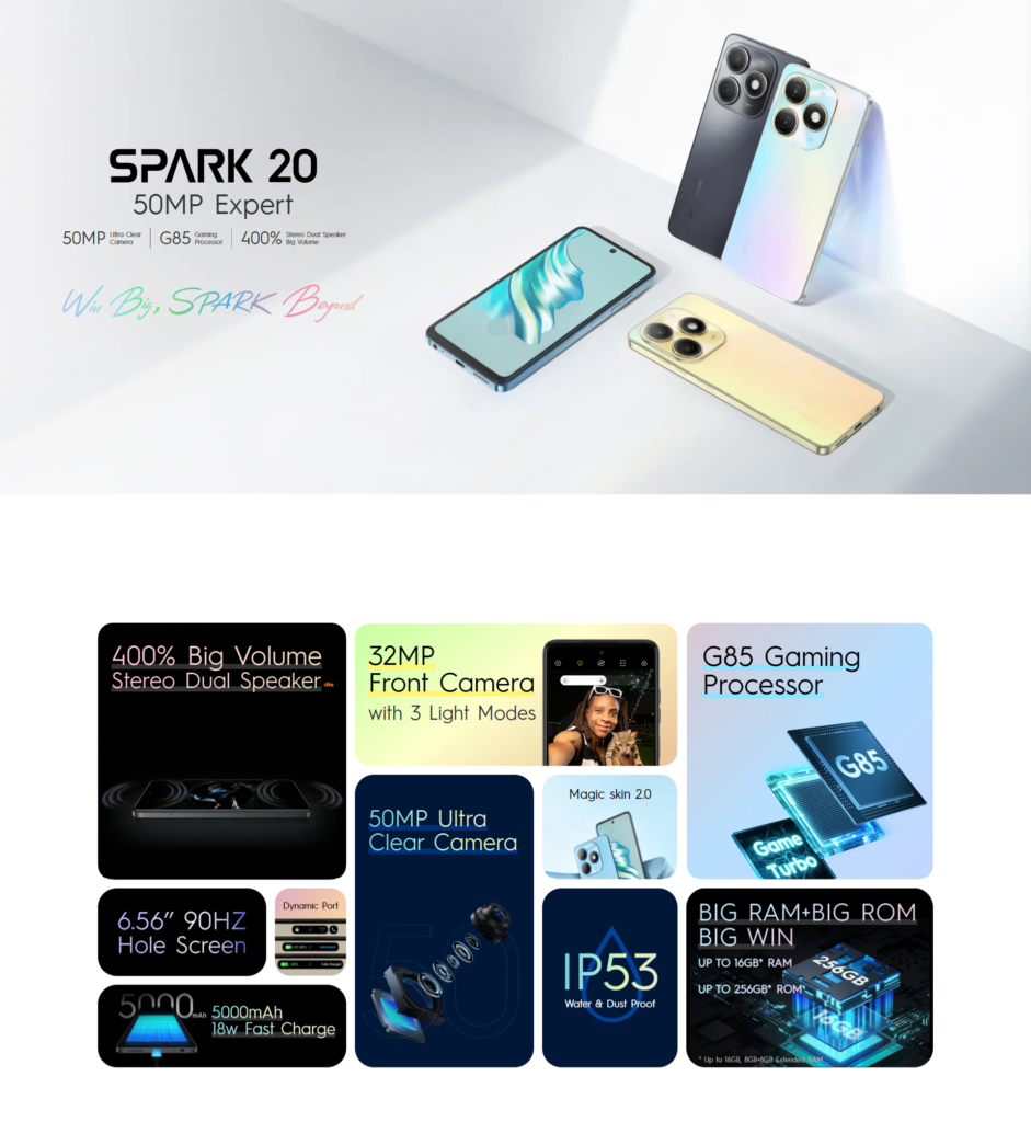 The Spark 20 Series is available in two memory configurations to meet varying needs. This version is ideal for everyday use, providing ample storage and efficient performance for most users. For those requiring more power and space. It offers expansive storage and enhanced multitasking capabilities, ensuring smooth operation even with demanding apps.